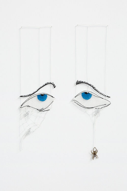 An actor who was part of a touring theater company as a child, Béna often brings elements of stagecraft into her practice. In one series, pairs of cartoonish eyes made from delicate lacework hang from strings, like marionettes. Eyes (Sad) (2023)—featured in the Foundations presentation of London-based gallery NıCOLETTı, which represents Béna—is one such work, with striking blue irises and arched, feminine eyebrows. Spiderwebs drip from these eyes like tears, with flying phalluses ensnared in their fibers, giving the work a surrealistic edge.