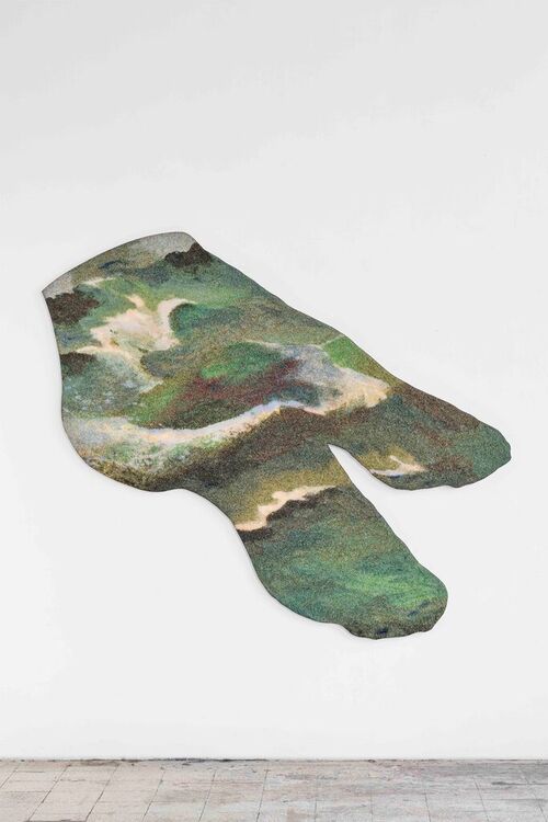 A standout work by Emmanuele, featured in Foundations with the Bologna-based gallery LABS Contemporary Art, is Un gesto cinico (2023; “a cynical gesture”). The large piece takes on an organic form resembling a truncated pair of feet floating on the wall, undulating with swathes of green and beige.