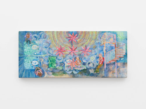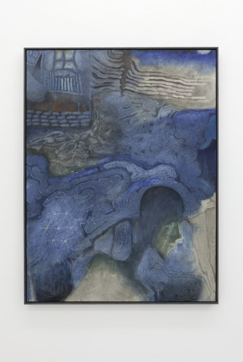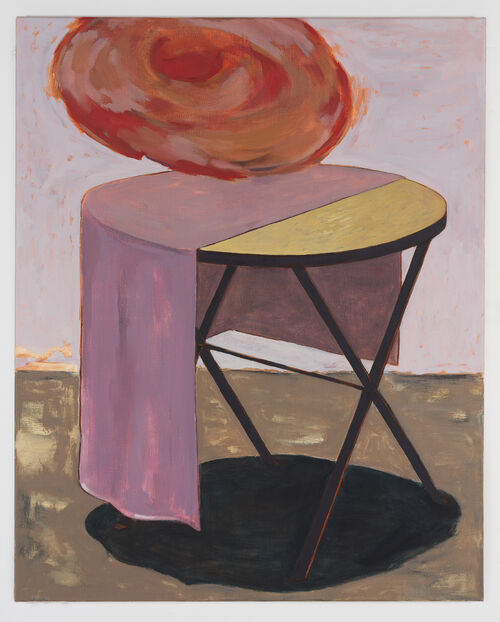 Similarly, Detroit native Flaugher’s contribution to “hello dust!” (whose title is taken from a poem by a 15th-century Buddhist monk) includes a series of paintings and installations focusing on stark depictions of furniture and interior settings. In these mundane scenes, something uncanny lingers—a single chair next to a white tablecloth-covered table, surrounded by blue spiraling specters, for instance, in Erratic Metric (2023).