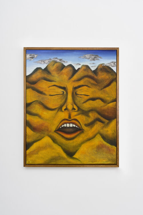 Haansen’s layered paintings, such as the dual landscape Murky Morning Early Grin (2023), are evocative of geological strata, blending organic forms and spaces in contemplative, withered scenes, while Nis-Hansen’s paintings examine the female form within contemporary contexts addressing themes of anxiety, illness, and societal expectations. She sometimes embeds the female form or faces into the environment, like the screaming face in the mountainside depicted in Woman ascending and descending a mountain (2021). Meanwhile, Takezaki’s paintings of mountainscapes translate experiences of nature into sensorial journeys.