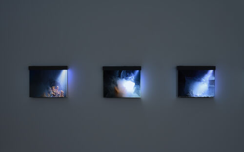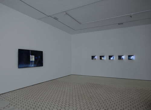 In one video on view at Wentrup, Permutations — CPU (2023), Berrada couples digital and physical manipulation. The work is a single shot, zoomed in on a computer chip, suspended in an aqueous solution. As in the “Cartes Mères” series, he runs electricity through the liquid. During the course of the slow-motion video, particles of gold float off the object’s surface like dust, echoing a process, Berrada explained, that has been used to recycle the metal from old computers. Slowed down so much that the moving image could be mistaken for a photograph, the process becomes absorbing and sublime, inviting comparison between our human perception of time and a longer-term planetary view, in which molecules are reused across millennia.
