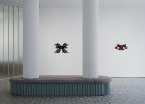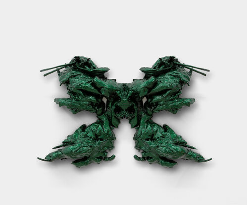 Shown for the first time at Wentrup, the artist’s newest series, “Hygres” (all 2023), is a set of wall-based sculptures formed out of 3D-scanned natural objects. These digital impressions—inspired by frottage, the technique of rubbing a pencil on paper directly over an object to create a relief, famously used by Max Ernst—are then manipulated using computer programs to create fantastical, mask-like shapes. Hygres #2 resembles a butterfly; another, Hygres 3, evokes a dragon. Painted with glittering, lustrous car paint, the sculptures combine natural formations and high-tech, man-made shimmer. “I take a little thing and make it big, or take a big thing and make it tiny,” Berrada said, describing his digital manipulation techniques. “Everything can mutate a lot because it has no weight; it has no physical properties.”