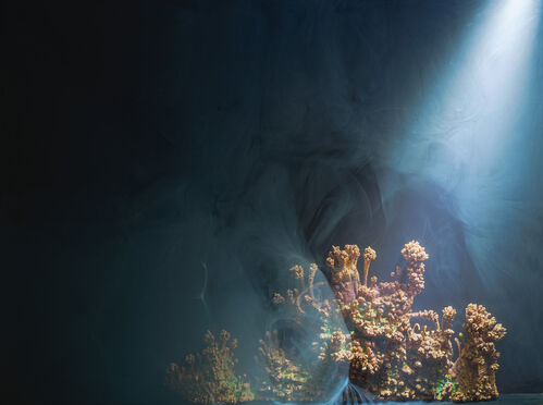 They look like underwater landscapes: Rocky coral ranges reach out of the depths, shimmering under a thin layer of smoke. In fact, these sculptures—part of the series “Cartes Mères” by Moroccan artist Hicham Berrada—are the results of chemical reactions, preserved in resin. Each captures a single moment in the experiments that the artist carries out in his studio, a kind of makeshift lab. While the artist describes himself as a sculptor, his works’ ultimate forms are a product of chance interacting with his own planning: “I never design shapes directly; I design setups so shapes can emerge,” he said.