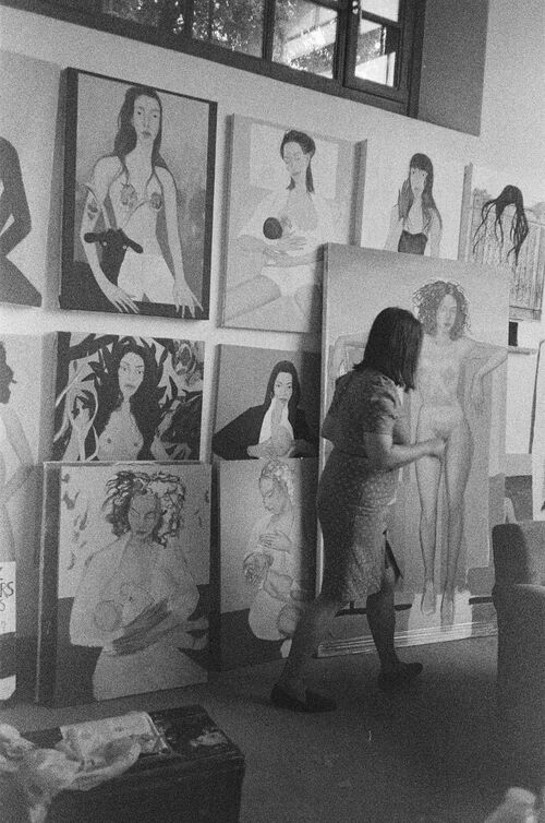 Today, Sokol creates art to directly challenge patriarchal norms, a stance prompted by her experience in Los Angeles. These experiences inspire a feminist upheaval in her new work, especially notable in her reinterpretation of Sandro Botticelli’s Primavera (ca. 1470). Her work LE PRINTEMPS [Spring] Linda, Nicolas, Raya, Dustin, Simone, Nirina, Claude, Bella, Dourane (2020) is a deliberate response to trans-exclusionary perspectives, featuring a group of nine trans and cisgender women together. Sokol’s work reimagines Botticelli’s narrative of fertility and consent by empowering each figure with an assertive, confident stance, celebrating the autonomy and diversity of all women.