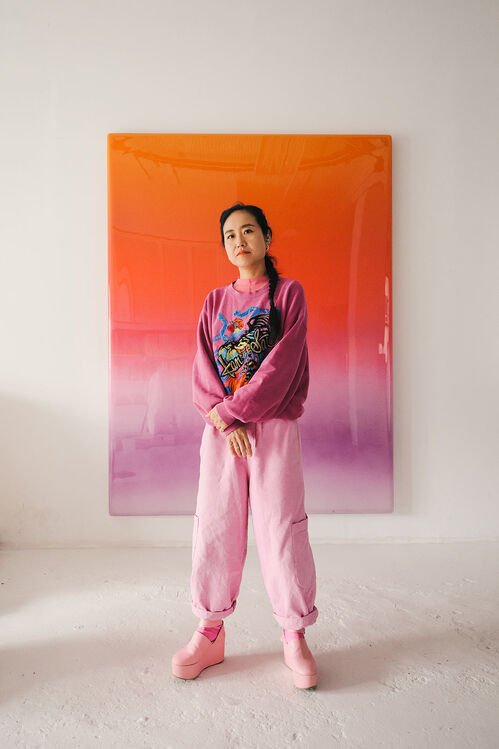 In this state of heightened sensation, viewers then encounter three colossal textile works. Part of Tajima’s “Negative Entropy” series, these abstract, framed weavings have a painterly quality from afar and exude spellbinding energy due to their scale and the sharp color contrast of their sweeping gradients. Up close, the intricate woven threads emerge. Like Vipassana, these works engage the senses, though in this case, Tajima has visualized sound waves. To make these massive textiles, the Brooklyn-based artist translated audio into spectrograms—visual representations of sound frequency—then sent the output to a textile mill in the Netherlands, where they were woven with a digital jacquard loom.