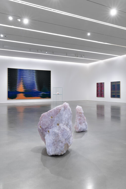 Sense Object is featured in “Energetics” alongside three other rose quartz monoliths—part of Tajima’s “Pranayama” series, named after the Indian breathing ritual. Tajima chose to incorporate rose quartz both in reference to New Age spiritual practices and because of its piezoelectric qualities, or its ability to generate an electric charge. Specifically, she underscores how it is used to power timepieces. “It sometimes feels like time is moving so fast—if you think about digital technology and what’s happening with that,” she said. “But then here’s a timepiece: the crystal that has been keeping time since however many gazillion years since being formed…. There’s all these temporalities in the show that help situate the viewer and myself within this timeline of infinity.”