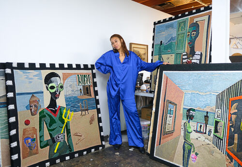 Mixed-media artist Akea Brionne also addresses the exclusivity of the art historical canon by analyzing the impact of colonial systems on cultural storytelling, identity formation, and assimilation. Her family’s own history of displacement and migration from Belize to Honduras and on to New Orleans left her without adequate ancestral archives, so Brionne relies on dreams, family lore, and imagination to portray her lineage. The resulting digitally printed jacquard tapestries imagine female figures, African masks, and Giorgio de Chirico–esque architecture in seaside landscapes comprised of fragmentary shapes and details that break apart.