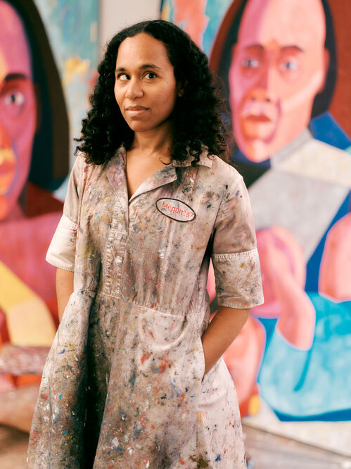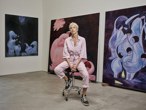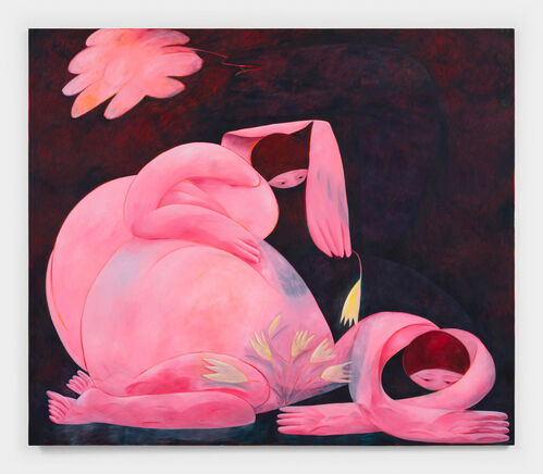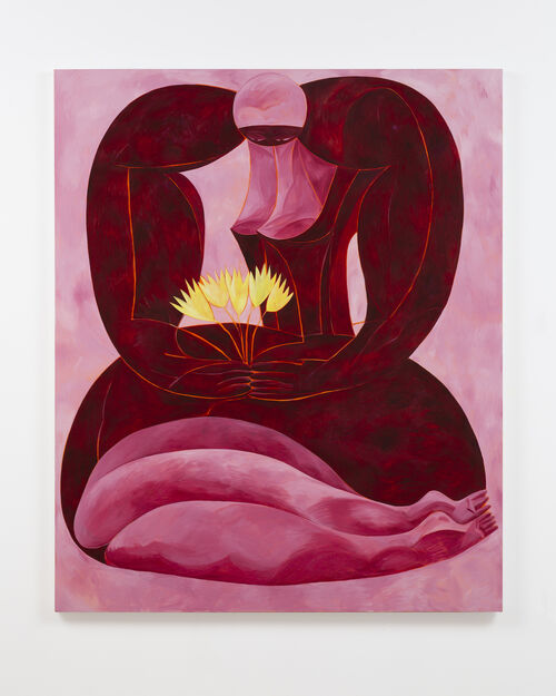 Some canvases feature a single figure filling the frame, while others depict forms splintering apart, suggesting an incarnation of past, present, and future selves collapsed into one scene. Hovering between an ethereal metaphysical realm and the sensuous corporeal world, the paintings press against the bounds of figuration. In the burgundy and cerise Our Human (2022), the swollen female figure appears to push back against the confines of her own form, her segmented features expanding beyond their natural boundaries—like a literal representation of the feminist imperative to “take up space.”