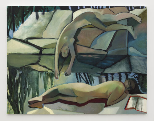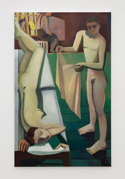 Danielle Orchard’s subjects seem more at home. Built up from thick impasto, colorful planes, and sharp, sensuous lines, her paintings envisage nude female bodies in quiet domestic interiors—often using Cubist techniques to create a subtle sense of unruliness. In Keep Warm (2023), a woman sleeps with her arm atop her book while another woman stands over her with a blanket. The flattened picture plane presents the sleeping woman’s body as vertical, the inverse mirror of the standing friend, to uncanny effect.