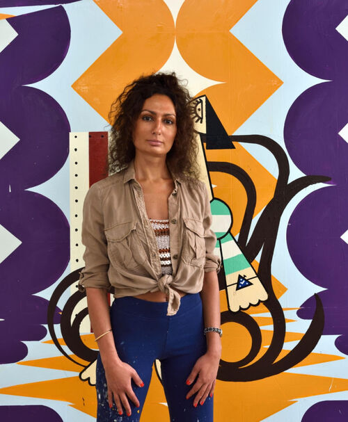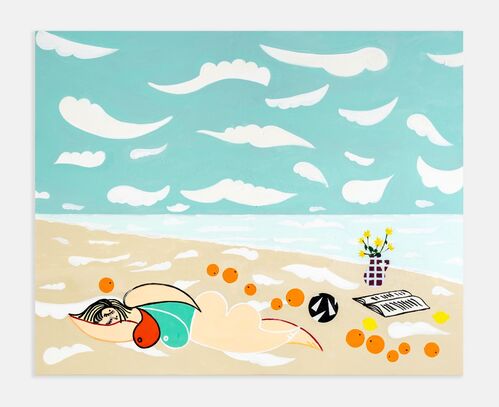 As an example, Honarpisheh pointed toward French Syrian artist Farah Atassi’s recent series of paintings that recall Picasso’s bathers as a means of exploring the relationship between artist and model and restoring the painted subject’s autonomy. First shown at Almine Rech, Atassi’s portraits of bathing women, assembled from graphic triangles, squares, trapezoids, and semi-circles, stare out at the viewer from flattened shorelines.