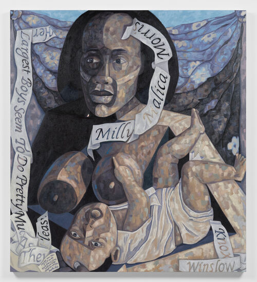 “Ahuja’s works use broad personal and historical contexts to create canvases that not only contain multiple perspectives but multiple gazes,” said Honarpisheh, “suggesting that the painting looks at us as much as we look at it.” In a 2023 exhibition at Aicon, Ahuja recast traditional portrait compositions, like those of the Christian Holy Family and royal weddings, with depictions of her 19th-century matrilineal ancestors. For example, As They Please (2022) depicts Ahuja’s forebear nursing a child and enwreathed by a banderole emblazoned with language from recently discovered familial archives. Co-opting a pose traditionally reserved for the Madonna and Child, Ahuja asserts her family’s place, and so her own, within the canon. Similarly, her appropriation of various Cubist techniques—which were themselves influenced by non-Western art traditions—restores a sense of artistic agency.