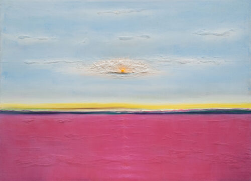 Mexican artist Yoab Vera’s textured landscape paintings glow with bright shades of pink, red, and orange, finished with final touches of concrete on canvas. Presented by Saenger Galería, “Scent of Time: Horizontes temporales” is set within the walls of Casa Gilardi—a space designed by Mexican architect Luis Barragán between 1976 and 1978. For the exhibition, Vera draws inspiration from the show’s venue as well as from Georg Simmel’s philosophy that landscapes in art are “the vital impulse” that animates our gaze.