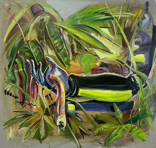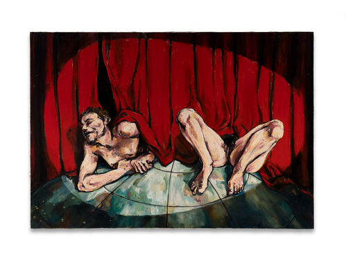 Over the years, Lezama has repeatedly reinvented his practice, oscillating between figurative, landscape, and allegorical themes. More recently, he has focused on creating more provocative paintings that make a clear statement. Though still challenging to the viewer, his early work instead relied on subtler actions and muted implications painted with darker tones. For instance, his 1997 painting Siglo de las Luces I depicts two bodies moving beneath a red curtain—one with the top half of their body out and the other with only their legs exposed. Throughout, this series exemplifies Lezama’s early ability to grab the viewer’s attention in his canvases based on heady philosophical themes.