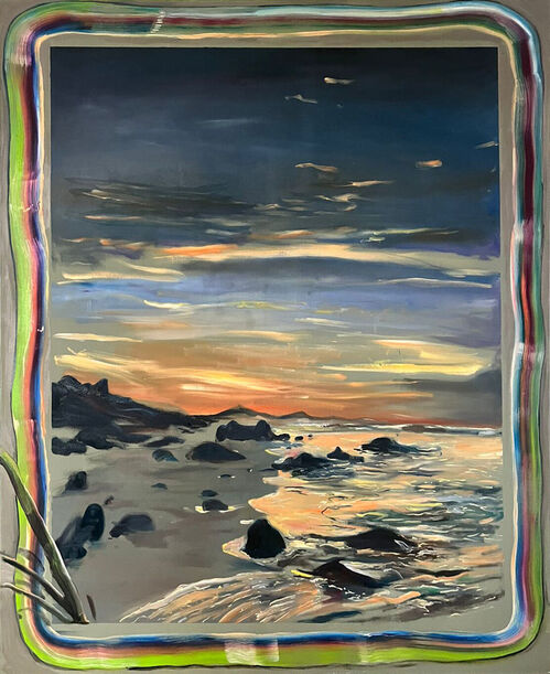 Vera employs oil, spray paint, and exposed cement to craft his landscapes. Works such as Horizontes Temporales: Reloj (Bolero) and Horizontes Temporales: Sólamente Una Vez (Bolero) (both 2024) capture the soft hues of the sun over an ocean, where the concrete creates a multilayered illustration. These works, alive with color, use sharp contrast to portray fantastical views of the distant horizon, evoking a longing for the future.