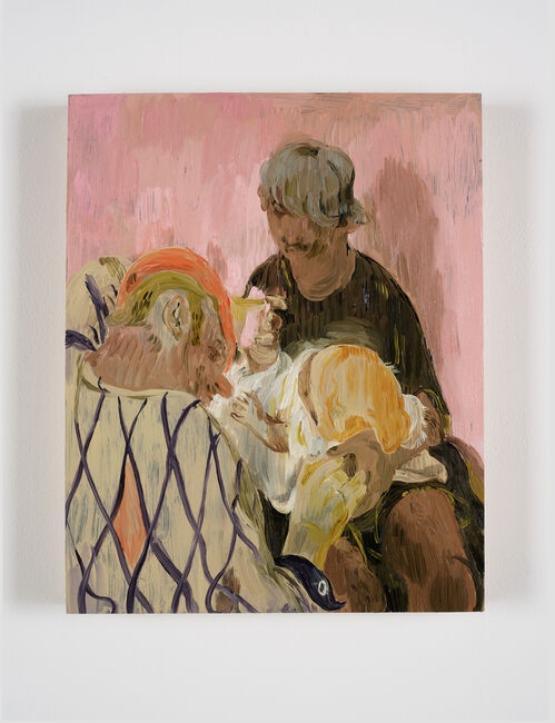 Some highlights are the uncanny geometric sculptures of Richard Rezac—a 72-year-old abstract sculptor based in Chicago—such as Untitled (19-06) (2019), which comprises a bumpy bronze on a mint-green wooden pedestal, a playful exploration of space and form that sets the tone of the entire presentation. Meanwhile, sought-after Pakistani artist Salman Toor’s figurative paintings of queer intimacy between people of color offer narrative depth, as seen in his new painting The Cuddlers (2024), which illustrates two adult figures close together holding a child.