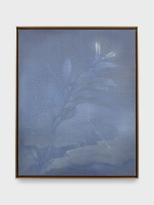 Allen’s meticulous process involves layering thin veils of oil paint, adding and erasing to achieve these evocative yet subtle juxtapositions, where the “germ” of an idea is constantly undergoing metamorphosis at the core of her paintings. She employs a nuanced tonal variation to softly render objects, giving them volume and depth, as shown by Weed (2023), a light depiction of a plant emerging from a crack in the ground.