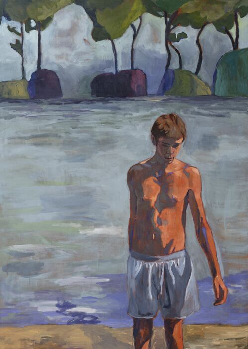 Reflective waters and illuminated trees, often in purples with orange or green highlights, serve as crucial elements to Sands’s narratives. Nico and his friend as the light changes on their day (2023) depicts two young men by a body of water and illuminated by a soft light, capturing a tender yet fleeting moment between companions.