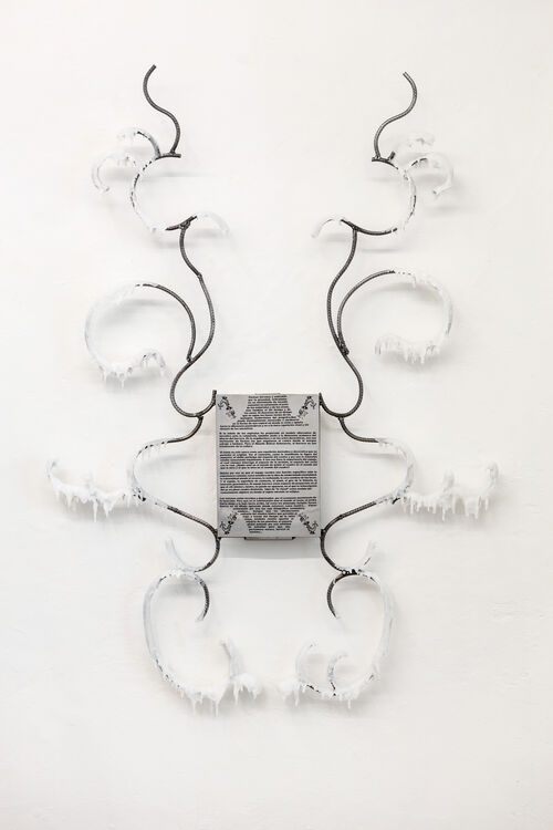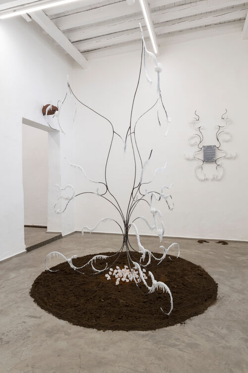 Giving its title to the exhibition is the sculpture Naab Taanaj (2024), a fantastical tree made from metal rods and paraffin rooted in a circle of dirt. This piece, along with the other metal flora works, symbolizes the connection between the land and water, a theme represented in Mayan culture through the water lily, or naab. Alfaro’s work reimagines these traditional motifs, highlighting the traditional mythological narratives that were later overshadowed by colonial history. Through this show, Alfaro intends to cultivate “a dialogue in history as a new form of archeology of the future,” he wrote in the exhibition text.