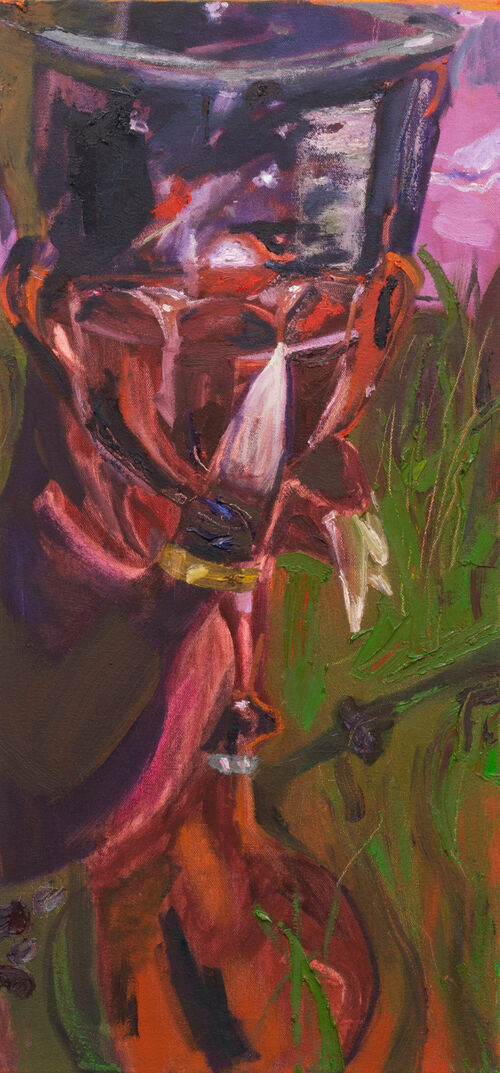 North Star (2023) shows how Slade successfully combines her myriad influences. The work depicts two figures sitting side by side; one dips her feet into a pool of water, while the other subject gazes at the bather longingly. Slade’s emphatic, almost abstract brushstrokes make it feel like we’re looking at the scene through a hazy filter, which adds to the painting’s dreamlike feel. Another canvas, Chalice (2022), is a red-bathed tableau centered on an especially wide goblet. The artist’s careful focus on this object helps the viewer to imagine its history, while the abstract marks help us to ascribe our own feelings and associations to the piece.