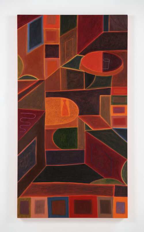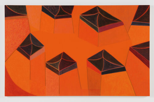 When We Were Here Last II (2023) features a vibrant outlay of geometric figures—concentric squares, tilted triangles, and semicircles work together to create a tantalizing tessellation. If you look closely at the composition, some of the cylindrical shapes and convex lines seem to resemble objects like water glasses and vases, which makes for a pleasant combination of abstraction and representation. Similarly, Endless (2023) shows an orange cylindrical form that’s giving birth to a multicolored rainbow of pink and red and brown. In the background, a white circle hovers atop a black background, making the painting look like a snapshot of a surreal nighttime scene.