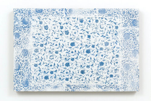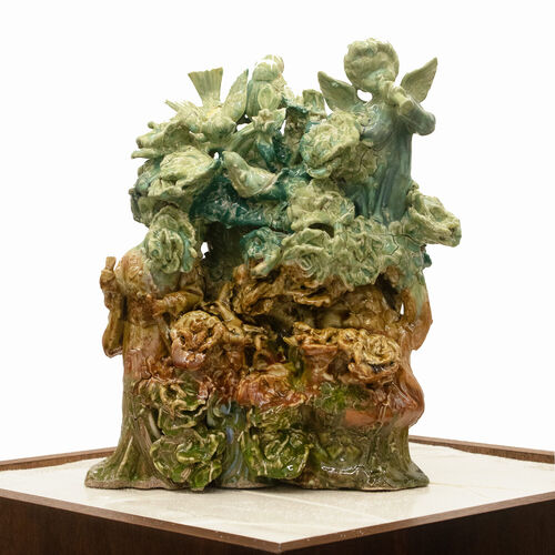 LaRissa Rogers uses sculpture, performance, and video to address complicated questions about identity and colonization. For example, her sculpture Keloid 3 (2023) cannibalizes tchotchke figurines, covering them with porcelain and glaze to create an enigmatic narrative that loosely references bodies and the artist’s personal experiences. Untitled (Skin) (2022) uses different formal decisions to meditate on identity—this piece is wrought from granulated sugar and acrylic paint on canvas. It is adorned with a blue floral pattern and a white background that are reminiscent of porcelain dishware, and Rogers’s decision to reference these motifs are commentary on Western fascination with Asian ceramics—also emphasized through her use of moon jar and kintsugi styles.