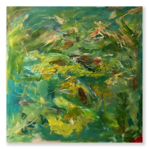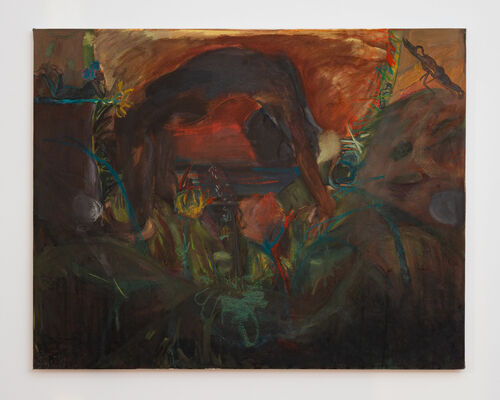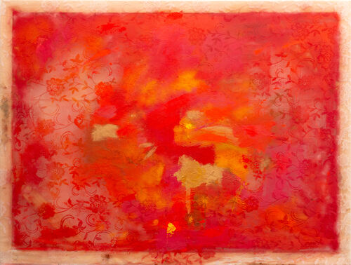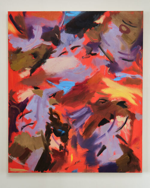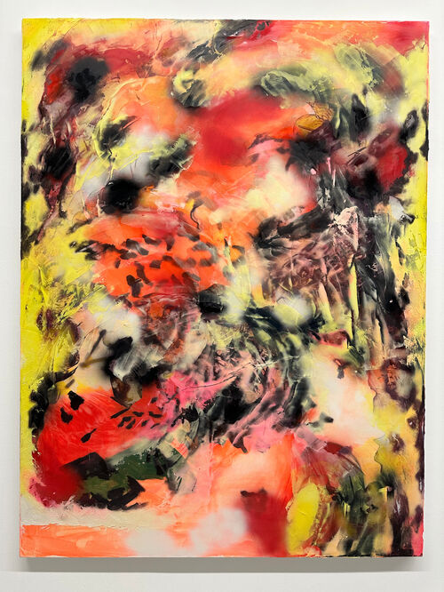 TBT (2024) is a cheeky combination of acrylic paint, resin, paper, spray paint, and plaster on canvas. Blotches of yellow and white paint obscure hazy images of landscapes, prompting the viewer to conjure a half-forgotten memory of a long-gone landscape. Elsewhere, his painting Firestorm (2023) is a cacophony of color. Vibrant red, orange, and yellow marks swirl around one another in a vortex of passion, hinting at possible devastation that exists just beyond our reach.
