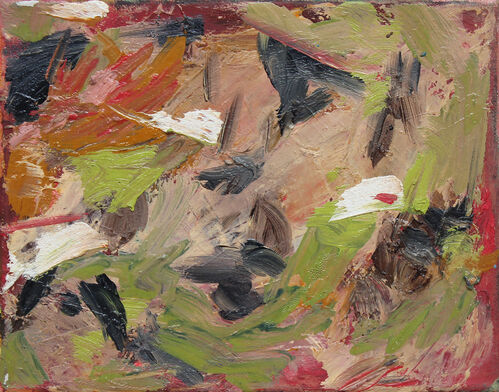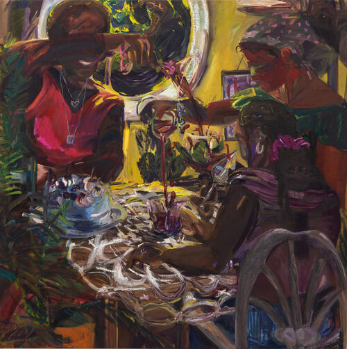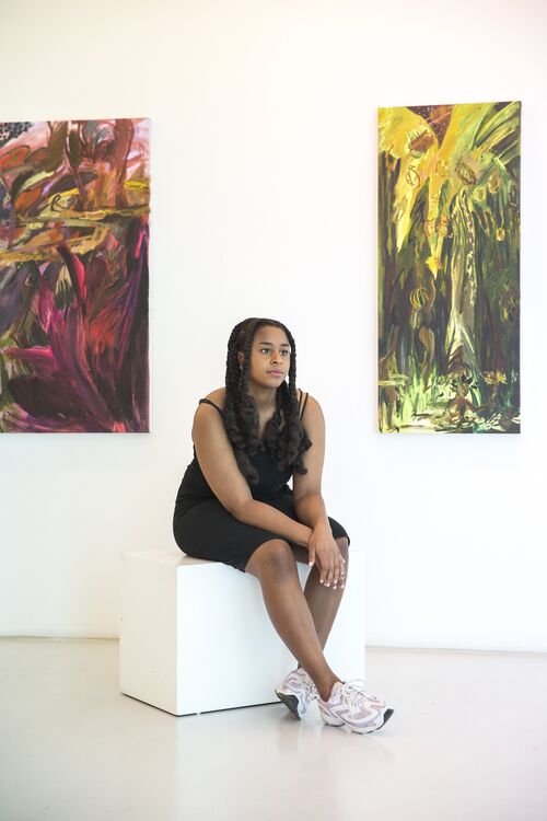 Through her emphatic brushstrokes, Corrine Slade is able to conjure narratives about Black femininity and dreaming. Her work deftly combines both representation and abstraction: Certain areas of her canvases are vibrant and spirited, recalling Abstract Expressionists like Jackson Pollock, but other sections of her paintings feel more controlled, like a delicately rendered Jan van Eyck. In a 2019 interview with LVL3, the artist said that she has diverse influences ranging from Romare Bearden to Helen Frankenthaler to Paul Cézanne.