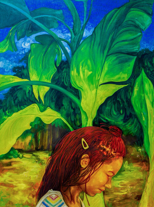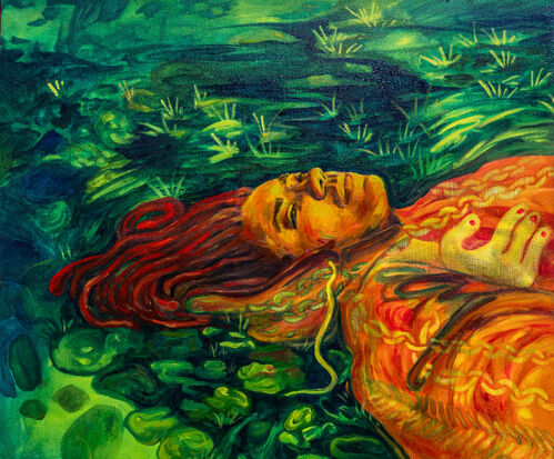 Hidden in the Hills (Fleurs du Mal) (2023), for instance, shows a woman trapped in her thoughts—the painting’s protagonist is sitting at a desk with her hand propped up to her head, and we can see the images in her mind floating above her. A pair of lovers lies in the grass, with yellow and purple plants swirling around them and the sun looming overhead. It’s a quiet moment, a moment of internal ecstasy that the painting’s subject can only return to inside their own head. Other works, like Between Land and Sea (2023) also unpack themes of interiority. The subject of this piece floats atop water and plants, much like the titular subject of John Everett Millais’s pre-Raphaelite masterpiece Ophelia (1851–52).