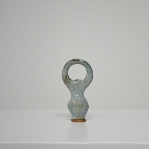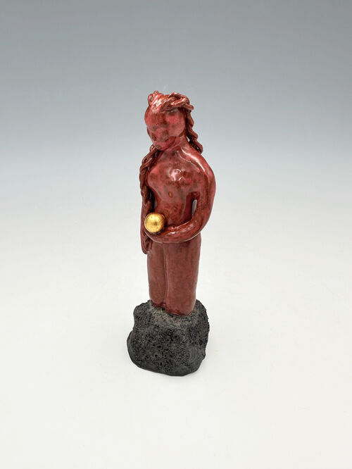 Take her piece Girl with Her Orb (2023) for example. The ceramic sculpture shows a girl, glazed in red, holding a golden sphere, and she seems to be looking down at her treasured object. The work references Scandinavian sculpture tradition, but also seems to reference deeply ancient depictions of female forms. Her piece Surrogate Series (01) (2021) is a bit more abstract—the sculpture resembles a curved figure with its arms held above their head in a circle, like a ballerina holding her hands in fifth position.