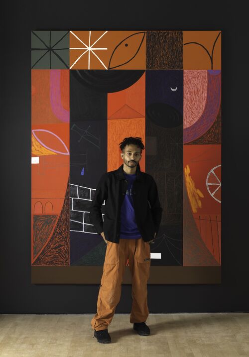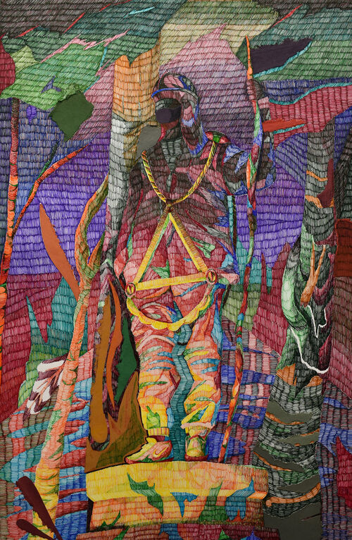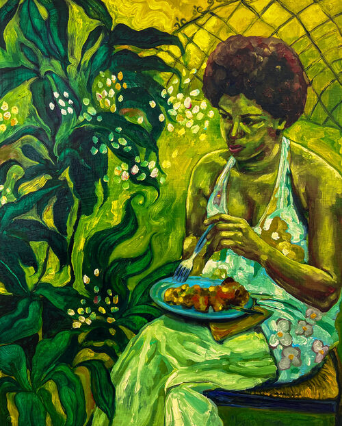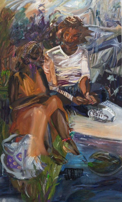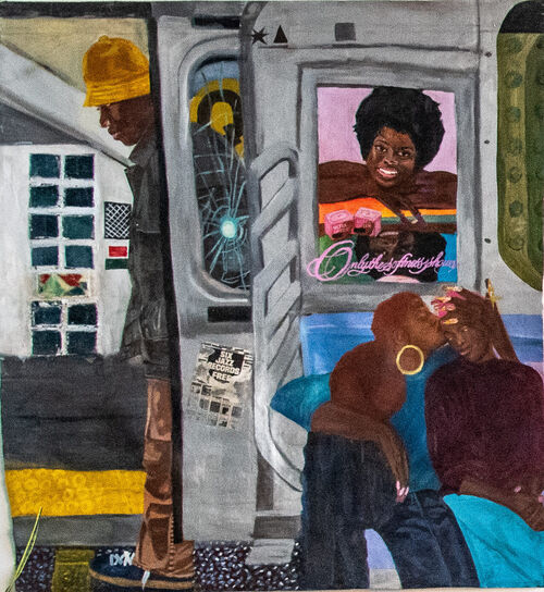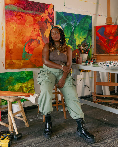 Working with acrylic and oil paints as well as found objects, Emily Manwaring crafts intricate narratives about urban Black communities that present escapist environments.
