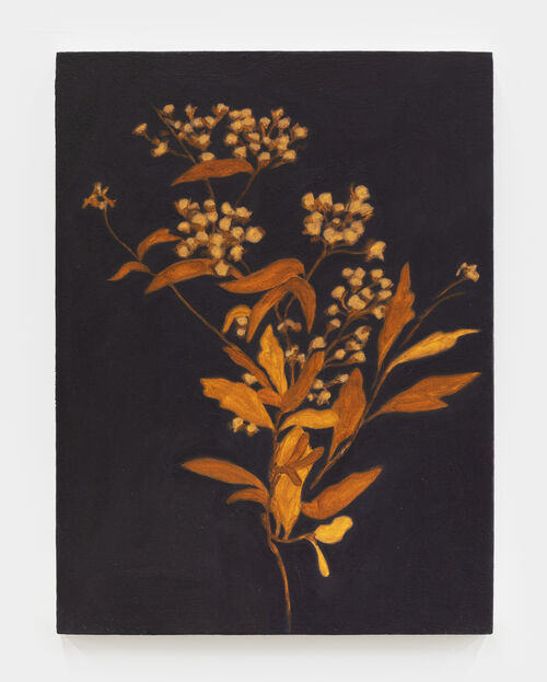 Now, after her father’s death, Tarver continues to use foliage to explore themes of nature and mourning. For example, her painting Nights 46 (2023) depicts two blooms set against a Prussian blue backdrop. Tarver’s use of negative space calls our attention to the plants, and urges us to contemplate the beauty and power of botanical life. Another work, New painting - nights, 4 (2021), is a similarly captivating rendering of plants. Clusters of alabaster buds and wilting leaves stand in sharp contrast to a flat black background. These flowers are thorough examinations of natural objects, and their composition is similar to that of a scientific illustration.