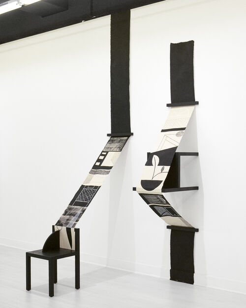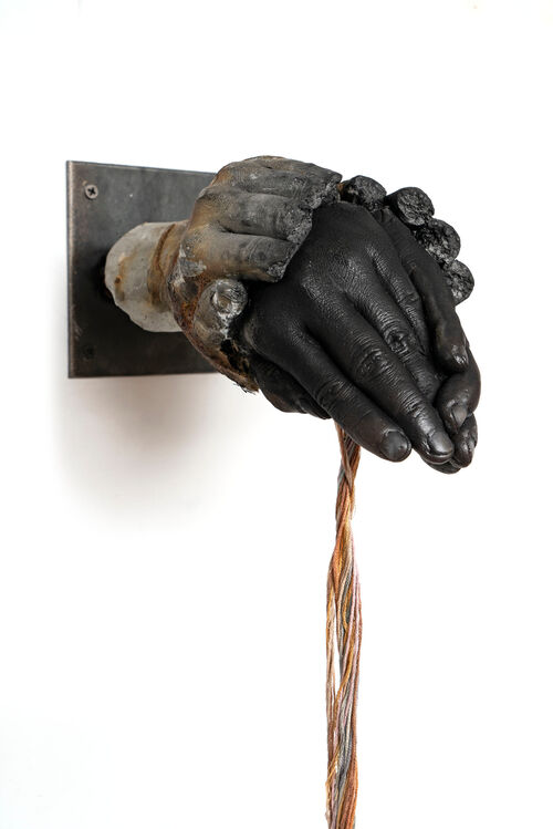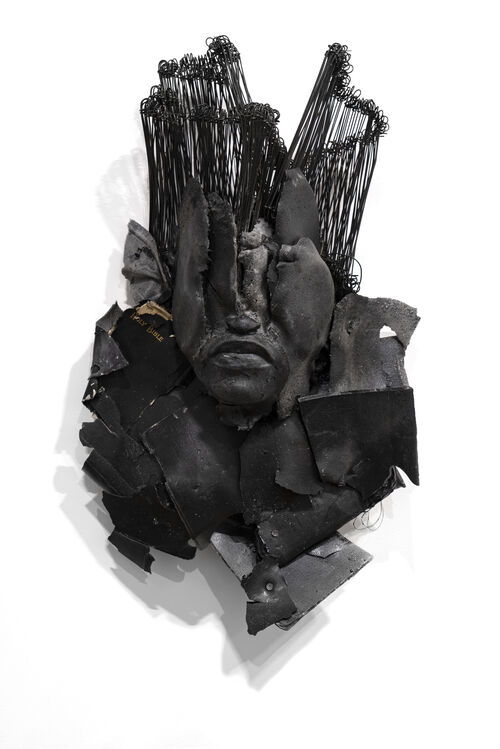 Chiffon Thomas’s multimedia sculptures pose questions about Black bodies and the spaces that they inhabit. To do so, the artist references corporeal forms—like limbs and torsos—and splices them with architectural details, such as staircases and window grates. Untitled (2023), for example, is a multimedia sculpture wrought from plaster, silicone, resin, fiberglass, and embroidery floss on steel. The piece shows two sets of hands clasped together, while delicate threads dangle from their fingertips. Another work, Untitled (2020), portrays a fragmented face with rebar wire for hair; there’s a Holy Bible growing from the side of the face, and its lips are slightly downturned in a frown.