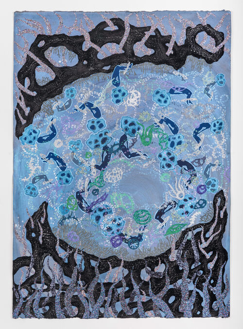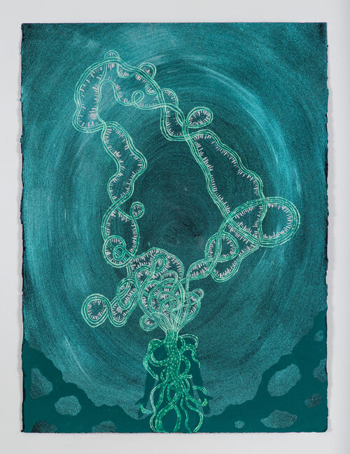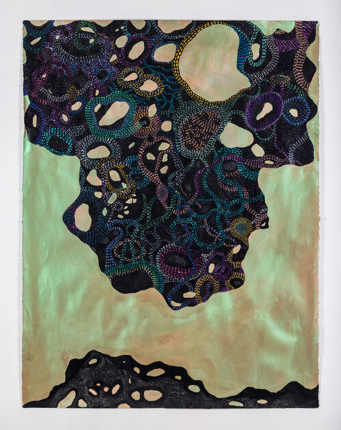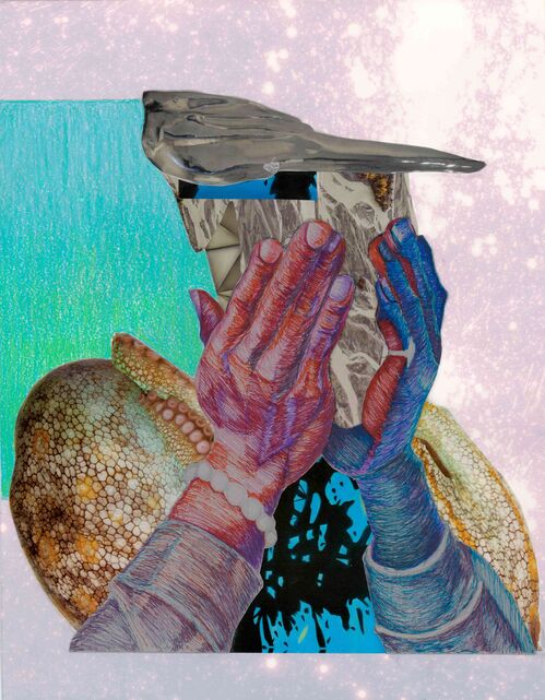 In the Shape of My Memory #2 (2021) is a multilayered abstraction showing black, purple, green, and yellow marks set atop a cream-colored surface that looks like the inside of a mother or pearl shell; the image is evocative of the sea and the animals that dwell there. This was intentional on the artist’s part, and many of their works have references to coral reefs and fictitious oceanic creatures, like mermaids. I Am Made of Sky and Mud (2022) also nods to mythology and the surreal, showing a pair of legs affixed to a meteorite that’s covered in craters. Tiny specks of glitter adorn the work and reflect small points of light, adding a delicate touch.
