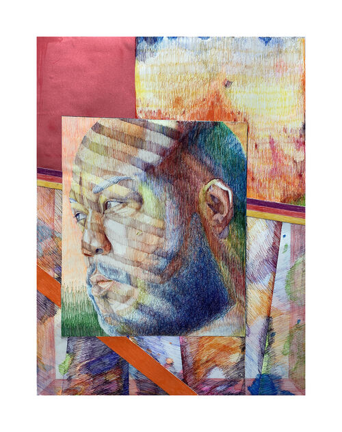 For example, his work Whirlpool. O (2023) shows a canary yellow cloth that’s draped across a red patterned window. Even looking at a photograph of the work, you can see that the way he shades and applies texture to the canvas is unique; he places multiple lines next to one another to create a pattern of straight and curved marks. Just in Case the Devilman Don’t Know (2017) is another example of Booker’s distinctive linework. The lemon yellow, cardinal red, and forest green portrait is a kaleidoscope of colors that create a dynamic portrait when they’re combined with one another.