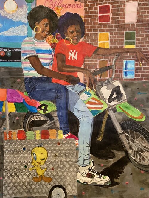 4 U (2021) is one such example of Manwaring’s ability to imagine new realities. The mixed media on paper piece shows two women riding a dirtbike on a sidewalk. One of the women wears a red shirt adorned with a New York Yankees emblem, while, in the background we can see a subway station that reads Utica Avenue, a clear nod to Manwaring’s upbringing in New York City. In Swish (2022), a complex composition, figures populate the entire painting, and bright blues and pinks accentuate certain areas of the canvas. Such formal choices were no mistake—the artist is deeply influenced by Kerry James Marshall and Faith Ringgold, and Manwaring’s knowledge of technique and art history comes across throughout her oeuvre.