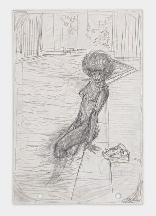 One of Vernon’s works on paper, Untitled (Love Calls) (2022), shows an unclothed woman slipping into a pool of water. The subject feels assertive—she sports a large afro, and gazes at us from the corner of her eye. Such a direct depiction of an unabashed, nude Black woman recasts this Black femme as person with her own agency, rejecting historical exoticised aesthetics of the past. Another of Vernon’s drawings, Untitled Glance (Janet Jumbo) (2022), is a portrait on paper of the Nigerian model Janet Jumbo. Jumbo also looks directly at the viewer with sultry eyes and pursed lips, her braids as well as two different earrings falling around her face. These accessories give the subject a distinct personality that both seduces and challenges the viewer.