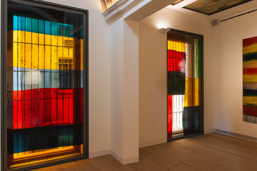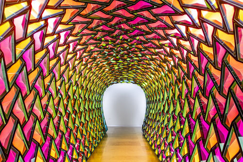 Sean Scully, for instance, transformed the former chapel of the Palacio, replacing its walls and domed glass with evocative blocks in primary colors; the work conjures the artist’s trademark intensity within the finely restored space. Olafur Eliasson brings a passage in the building to life with a tunnel constructed from 1,035 uniquely designed pieces of glass, turning the entrance into a kaleidoscopic rainbow.