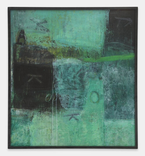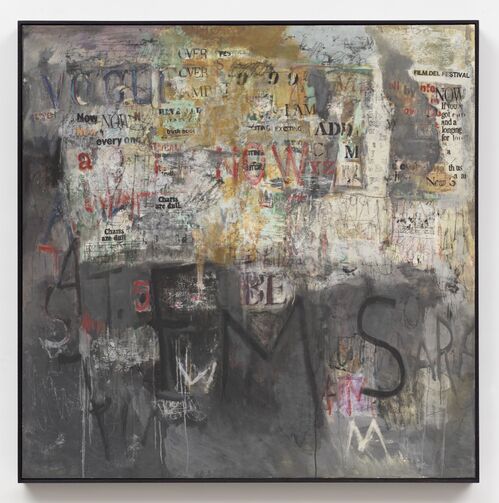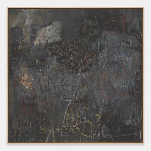 The same year, she painted Charts are dull. With a gray, chalkboard-like background and foreground covered in layers of paint and text, the work is visually complex, resembling a graffitied city wall. The text, inspired by and sometimes quoting from American mass media, includes legible words such as “Vogue,” “truth,” and “exciting,” as well as a glimpse of the work’s title. With words and symbols overlapping, truncated, and obscured by layers of paint, the composition recalls the visual overload of urban life.