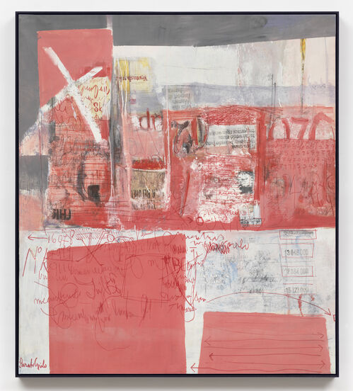 Before moving to New York, Grilo had focused on color and geometric shapes. As she developed her voice in the city, she began incorporating text physically transferred from American magazines, recalling the Pop artists of the day, as well as collage, her own handwriting, and layers of oil paint. Her body of work from 1963 shows elements of this shift. Some include bold, abstract compositions characteristic of her earlier pieces, such as Pines, Ochres and Green and Orange and mauve (both 1963). In these, she explored color and brushwork techniques, applying paint in several layers, some thin and washy with visible drips, and some thick, almost gritty, seemingly applied with a flat object like a palette knife.