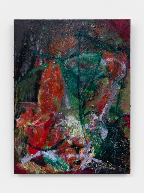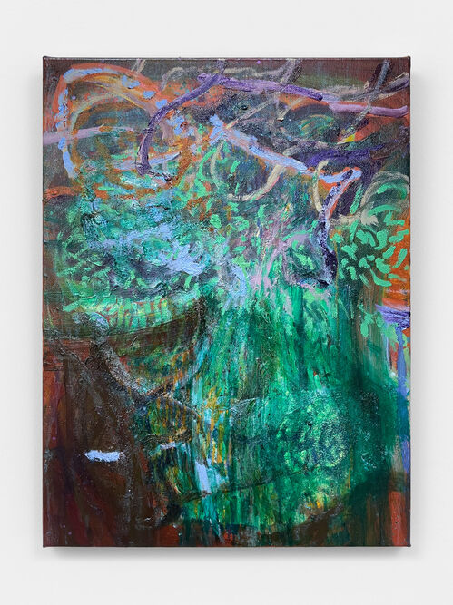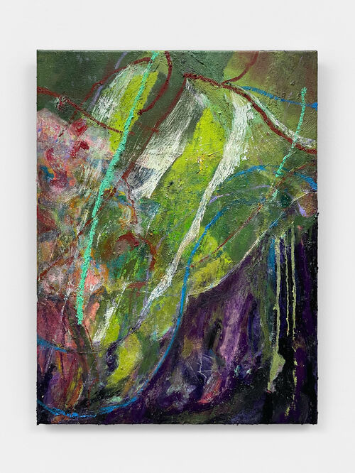 There’s tension, destruction, and chaos embedded in the works, Harris explained. Her approach is intuitive and spontaneous; often paintings move through her studio from a corner, to the wall, to the floor or vice versa, undergoing an act of “weathering.” A prime recent example is Shards of Grass (2023), a small canvas that she began last April made up of writhing gestures and swathes of color—from chartreuse and olive greens and deep, velvety purples, hints of pink, rusty reds, and streaks of white—all vibrating with texture.