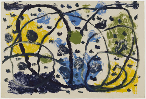 Whitney spent the next few years immersing himself in the art scene while working odd jobs and painting in his free time. In 1970, he began an MFA at Yale and started using acrylic. “I saw other artists like Larry Poons and Morris Louis and my teacher, Al Held, doing it, so I gave it a go,” he said. The exhibition includes a large-scale painting from this time, Untitled (1972), which he made with a mop, a tool he used at the suggestion of Held. “I thought he was crazy—a mop!” said Whitney. The work has layers of paint built up from the background and thick, gestural lines that swirl across the surface. This exploration of gesture and the spatial orientation of background and foreground remained characteristic of Whitney’s work for decades.