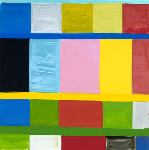 The horizontal lines and grid he established in the ’90s became defining characteristics, now appearing as four defined, yet imperfect, rows with the larger bands on the top—the second row typically spanning the greatest height—and the smallest on the bottom. Using this framework, Whitney continues to investigate color, using subtle variations of solidity and opacity from rectangle to rectangle and embracing the materiality of paint itself with drips and visible brushwork.