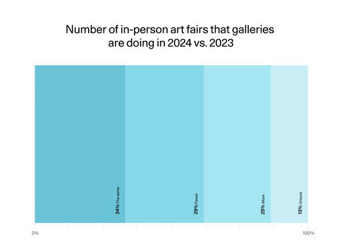 Heading into 2024, just a quarter (25%) of respondents said that they will be taking part in more art fairs than they did last year, and 34% of respondents said that they will be participating in the same number. Some 29% said they will be taking part in fewer fairs.
