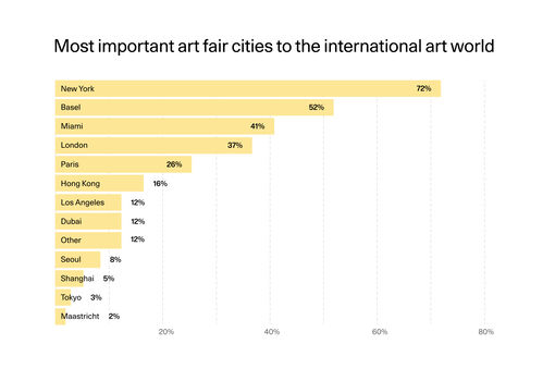 When asked what cities with major art fairs are most important to the international art world, this combination comes to the fore. New York was identified by the most respondents (75%) as among the most important art fair cities in the international art world. As well as its deep art scene and resilient concentration of collectors, the Big Apple has two distinct annual art fair moments—two weeks in May, anchored by Frieze New York; and a week in September, anchored by The Armory Show—whereas most cities tend to have one.