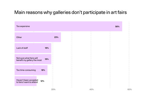 As the chart above shows, a majority (56%) of galleries that don’t participate in art fairs consider them too expensive. The resources required for galleries to participate in fairs can also make them difficult to partake in—some 19% said they don’t take part in fairs due to a lack of staff, and 18% said that the events are too time-consuming.