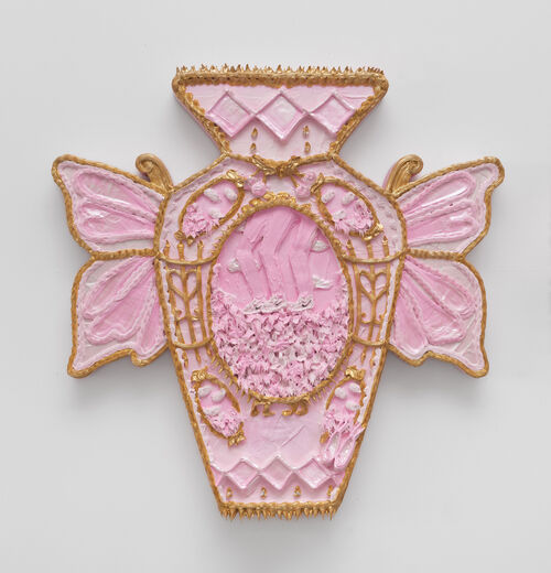 This nostalgia is related to the hyperfeminine movement to reclaim cuteness and girliness—the gendered conceit that’s wrapped in stereotypical ideas of cuteness, submission, and innocence. At Yvette Mayorga’s aforementioned solo show at The Aldrich, “Dreaming of You,” the painter applies a signature “Mexican pink” paint using bakery-grade piping bags, in homage to her mother who worked as a baker in a Chicago department store after immigrating to the U.S.