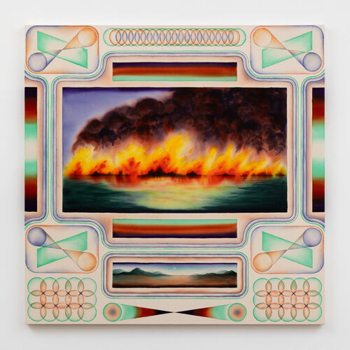 Michael Childress’s painting Burning Ring / Desire (2023) brings together the artist’s signature use of geometric abstraction, while exploring the environment.