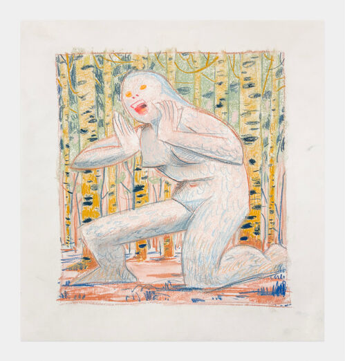 Williams, who has an upcoming retrospective at the Columbus Museum of Art in April, contributes the drawing A Sound Around No One (2024), which depicts a figure shouting in a forest. “When she paints she does all these amazing techniques. She’s like a wizard with paint, but with the drawings you actually can see her hand in it, and I think there’s an emotion to the drawings that she talks about as an integral part of this process of making these paintings,” said Rob.