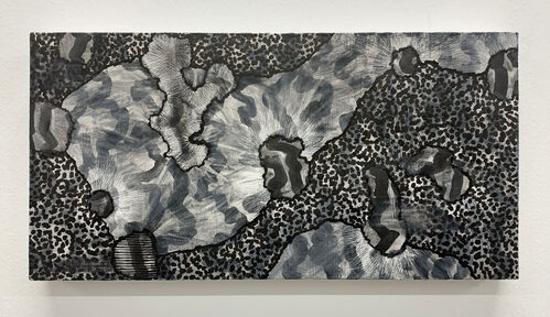“Adapt Adopt” is centered on dichotomies—most clearly represented by the sharp contrasts in her black-and-white paintings on muslin or wood. Paintings like KuroKuroShiro XL (2024), a 6-by-12-inch Sumi ink painting on muslin wrapped on wood, gesture to the myriad color gradients between black and white, breaking down this rigid dichotomy. Sugawara-Beda’s work, a testament to the ongoing dialogue between the traditions she inherits and those she encounters, challenges viewers to reconsider static views of culture and identity.