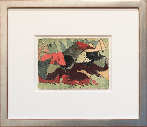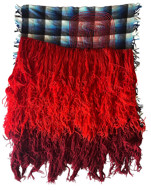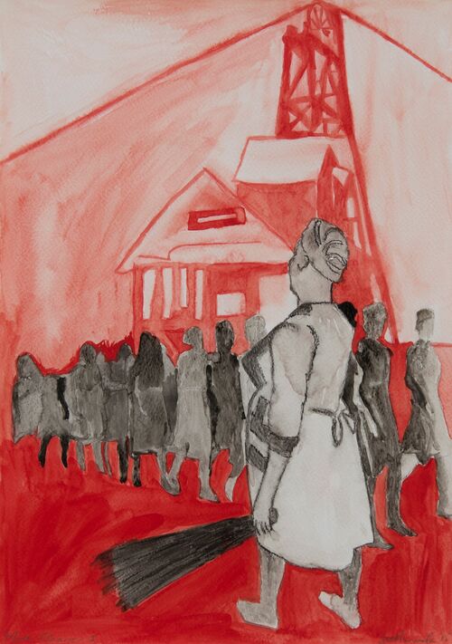 Her textile piece Failing 19 (2017–23), featuring red wool hand-stitched onto a mixed fabric blanket, is evocative of the pain experienced by women during the apartheid era. Her watercolors are also drenched in shades of red: Mine Cleaner 7 (2023) is a figurative painting portraying a woman against the backdrop of industrial structures, more South African historical and cultural references.